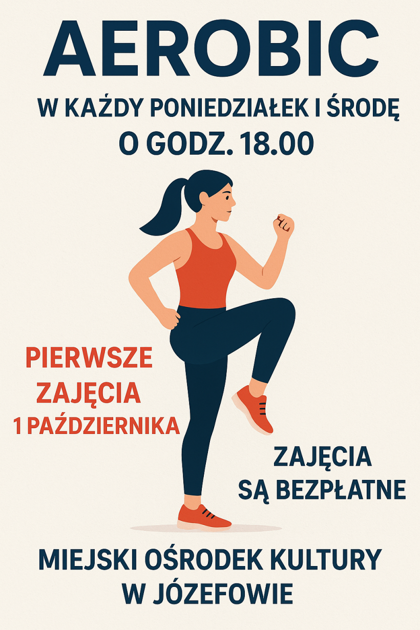 Zajęcia aerobicu będą odbywać się w każdy poniedziałek i środę o godz. 18.00 w Miejskim Ośrodku Kultury w Józefowie, począwszy od 1 października 2025 r. prze Panią Małgorzatę Dobrut. Zajęcia są bezpłatne !!!! Serdecznie zapraszamy !!!