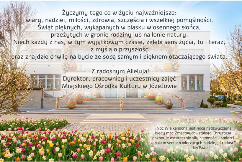 Życzymy tego co w życiu najważniejsze:wiary, nadziei, miłości, zdrowia, szczęścia i wszelkiej pomyślności.Świąt pięknych, wykąpanych w blasku wiosennego słońca,przeżytych w gronie rodziny lub na łonie natury.Niech każdy z nas, w tym wyjątkowym czasie, zgłębi sens życia, tu i teraz,z myślą o przyszłościoraz znajdzie chwilę na bycie ze sobą samym i pięknem otaczającego świata. Z radosnym […]