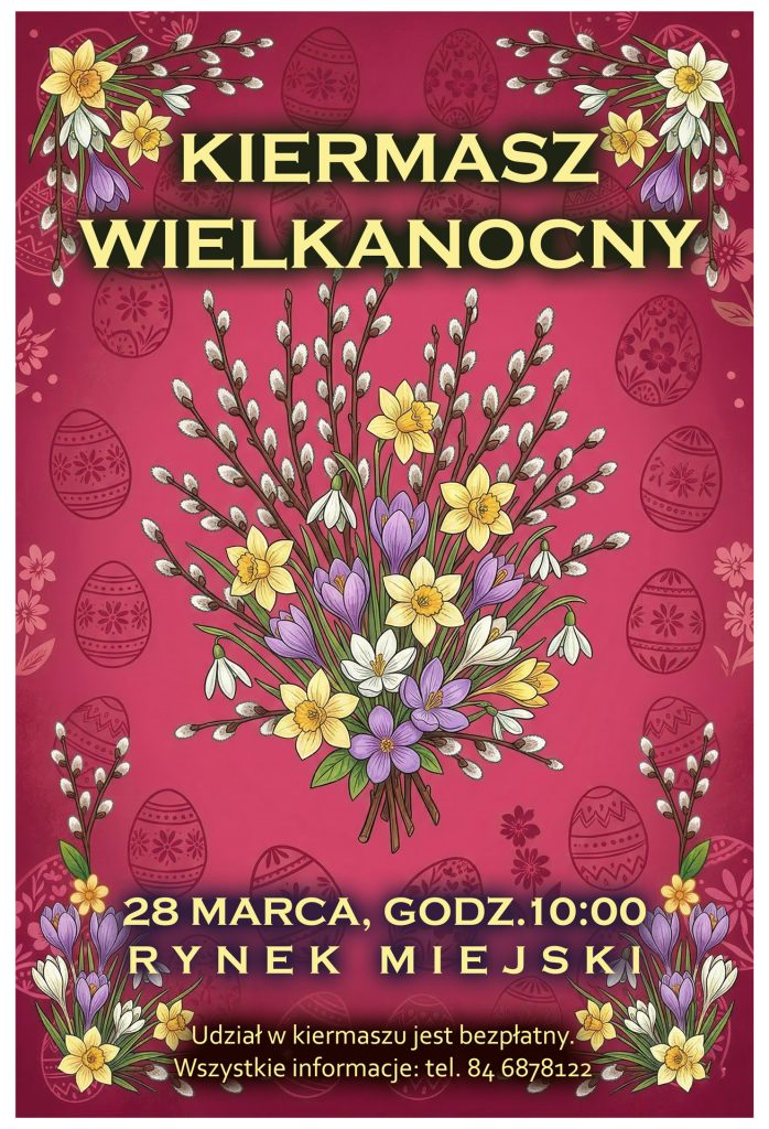 Serdecznie zapraszamy na Kiermasz Wielkanocny, który odbędzie się dnia 28 marca o godz. 10:00 na Rynku Miejskim w Józefowie. Zapraszamy wszystkich zainteresowanych, w tym wystawców z wyrobami regionalnymi, Koła Gospodyń Wiejskich oraz osoby chętne do prezentacji swoich prac i produktów. Udział w kiermaszu jest bezpłatny. W przypadku zainteresowania lub potrzeby większej ilości informacji, prosimy o kontakt pod numerem telefonu 84 6878122.